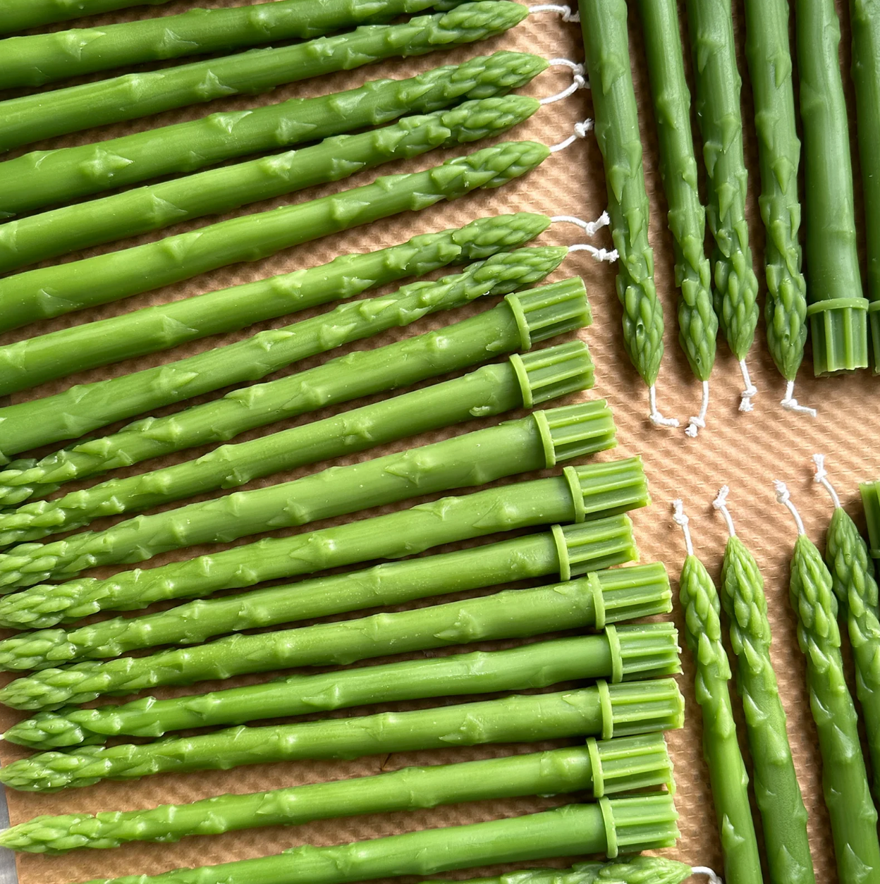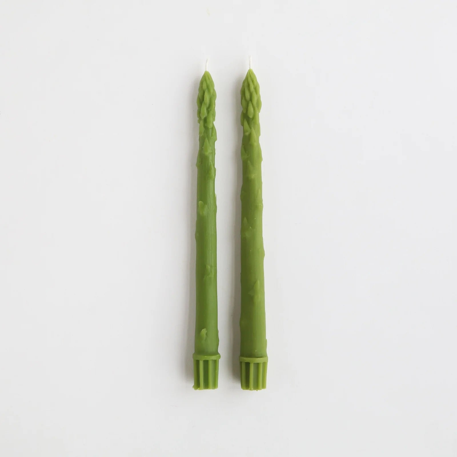 A playful nod to the early harvest, these sculptural taper candles are cast from real asparagus spears and hand-poured using 100% pure beeswax. Each taper is crafted with a slotted base to ensure a secure fit in standard candle holders.