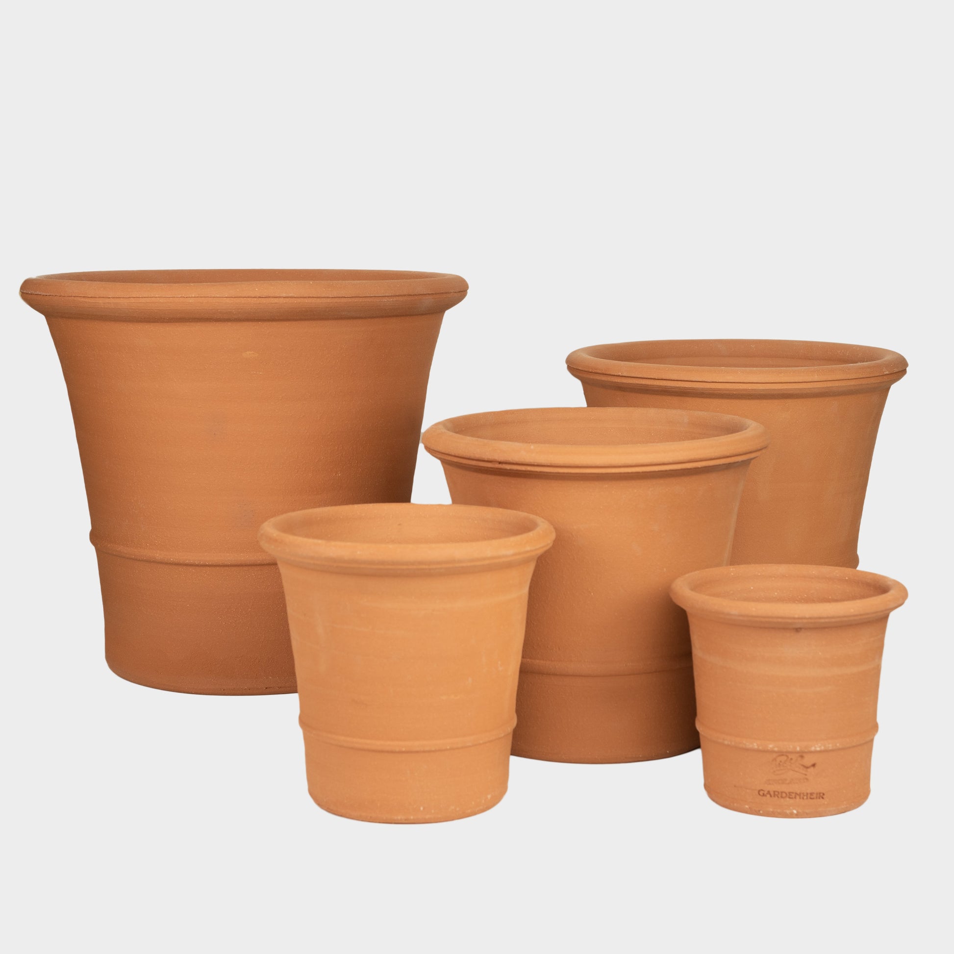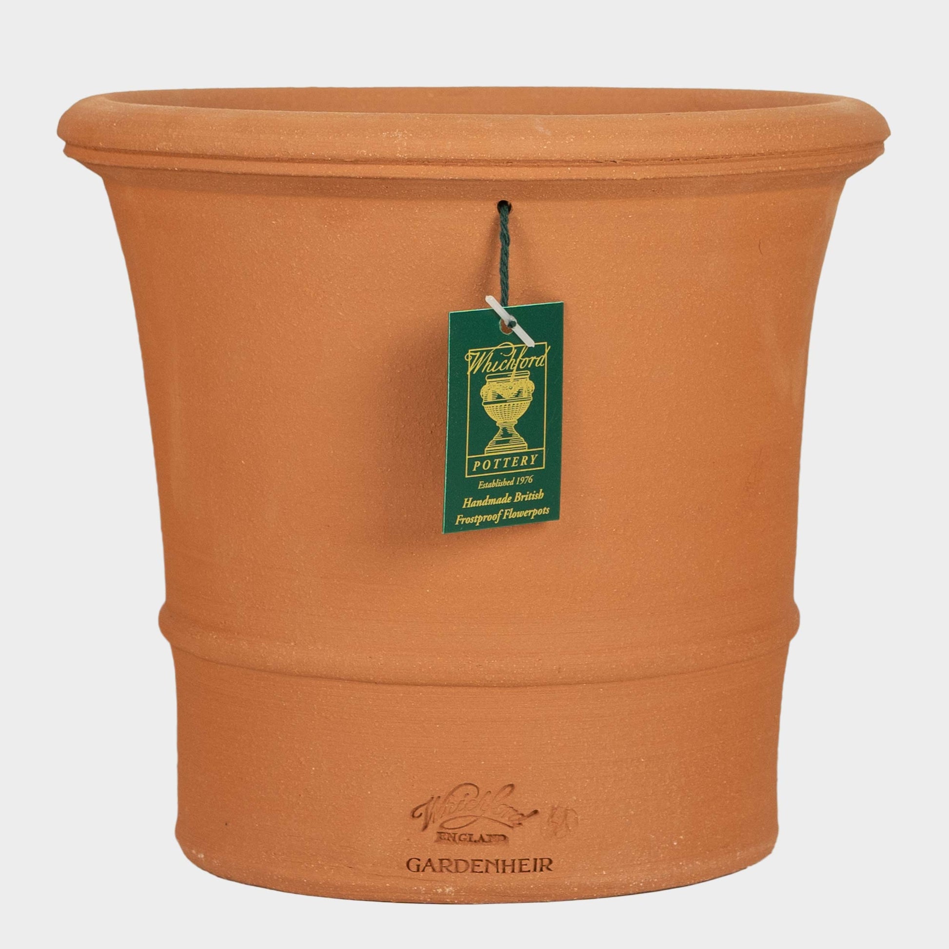 The English Terracotta Classic is our collection of essential pots, suitable for a large variety of plants and locations. A wide base provides maximum stability and room for root growth, making it an ideal choice for most plants, whether shrubs or container companion arrangements. Perfect for front door and patio displays or integrated within your garden. A sturdy rim and band detail will help ensure a confident grip for movement. Discretely decorated with both Gardenheir and Whichford Pottery logos.