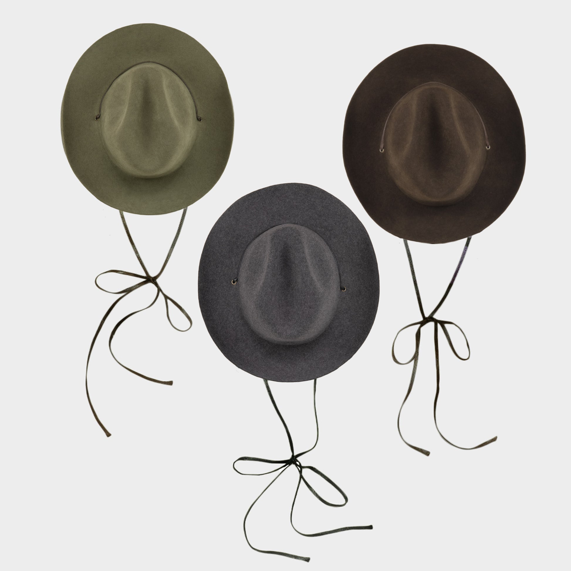 Minimalist, classic felt hats. Think of Walt Whitman, Edward Carpenter, Vita Sackville-West, and the cowboy hat of course for inspiration between the the wool hat and the outdoors. This version in Walnut features a removable flat braided and waxed cotton cord that can be used to tie under the chin or for hanging the hat loosely onto your back.