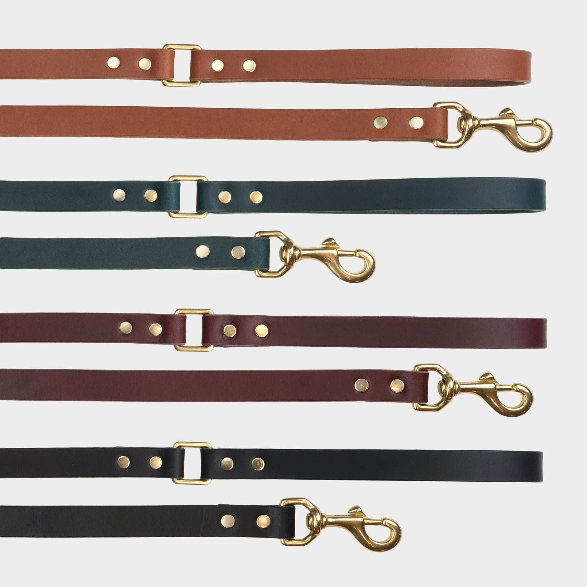 This handmade leather leash is ideal for both country constitutionals and walks around the block. Robust vegetable-tanned leather from Tuscany stands up to the strongest pullers, and handsome, solid-brass hardware is built to last. A square loop at the handle keeps keys and accessories nearby.