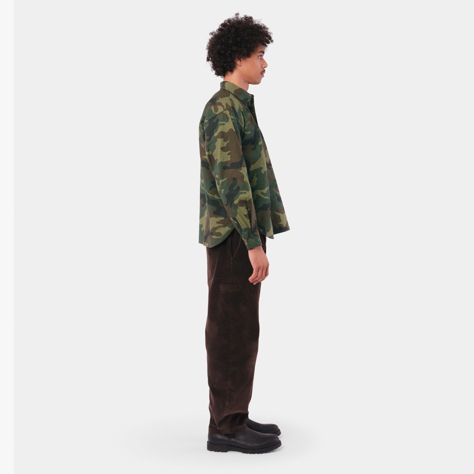 Our Gardening Smock No. 2, with its classic shirt collar, welted breast pocket, and a slightly shorter cut, now done up in a classic camo pattern that's versatile for looks but also practical, great for hiding muck (or hiding out)!