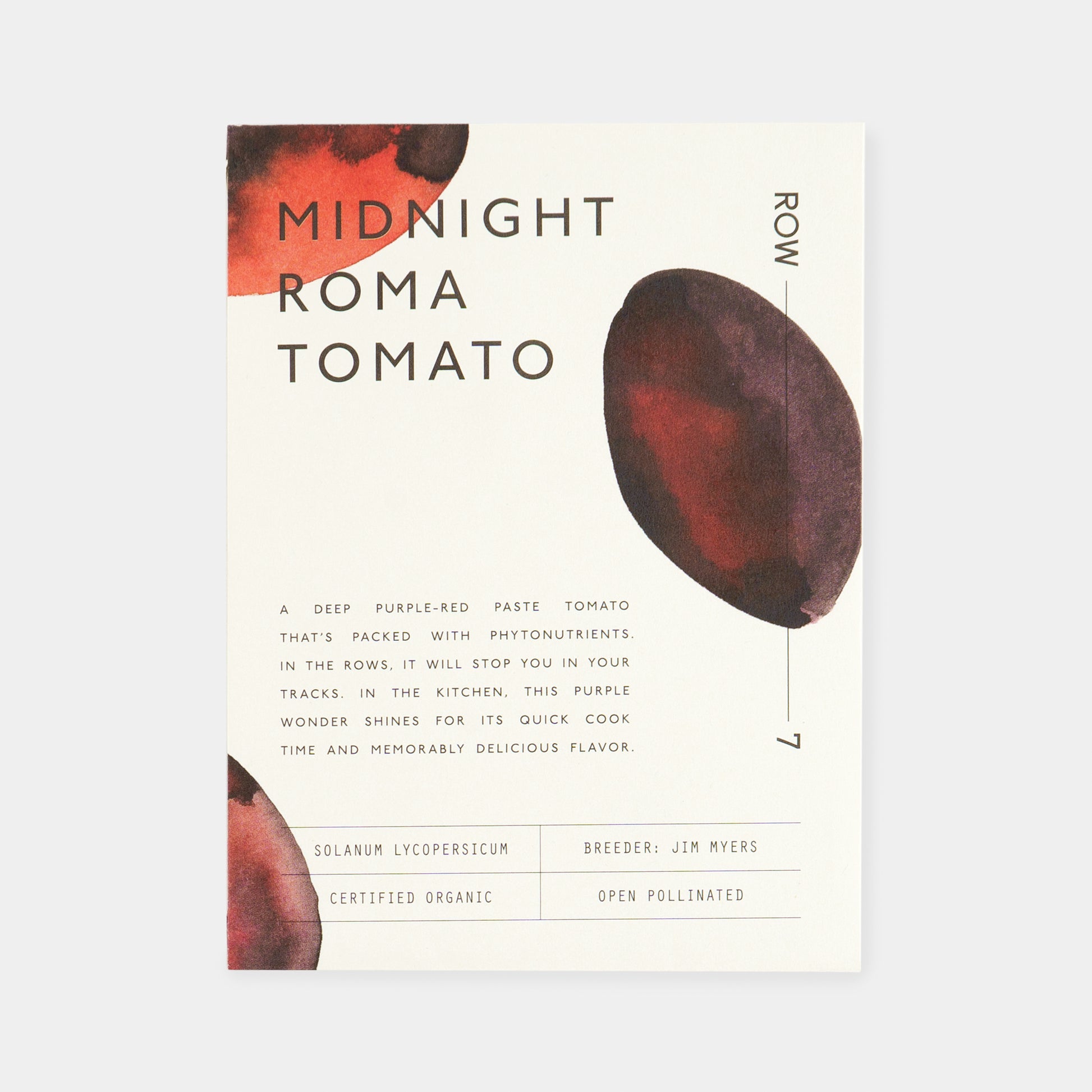 A deep reddish-purple high-antioxidant plum tomato, the Midnight Roma Tomato from Row 7 is a feast for all senses. In the garden the beautiful purple color dazzles, getting richer in direct sunlight. In the kitchen, we love this purple wonder for its quick cook time and memorable flavor, ideal for producing sauces and pastes with layers of sweetness, acidity and rich umami. Roast them to bring out their sweetness, or chop and add to salsa or salads. Semi-determinate. 80 days to maturity.