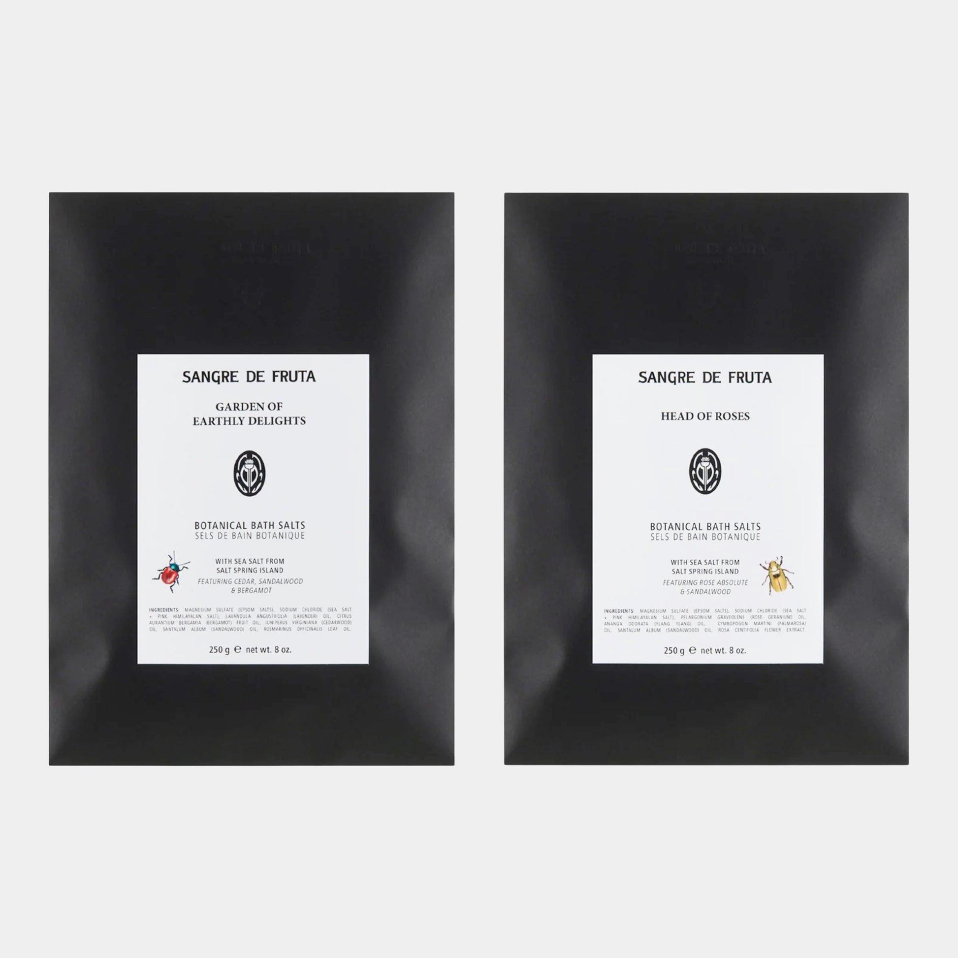 Like a therapeutic soak in the warm ocean. A little goes a long way with the Sangre de Fruta artisanal bath salts. Scented with their signature pure essential oil blends, featuring a high magnesium hand-harvested sea salt from Salt Spring Island, and high vibration pink Himalayan salts.
