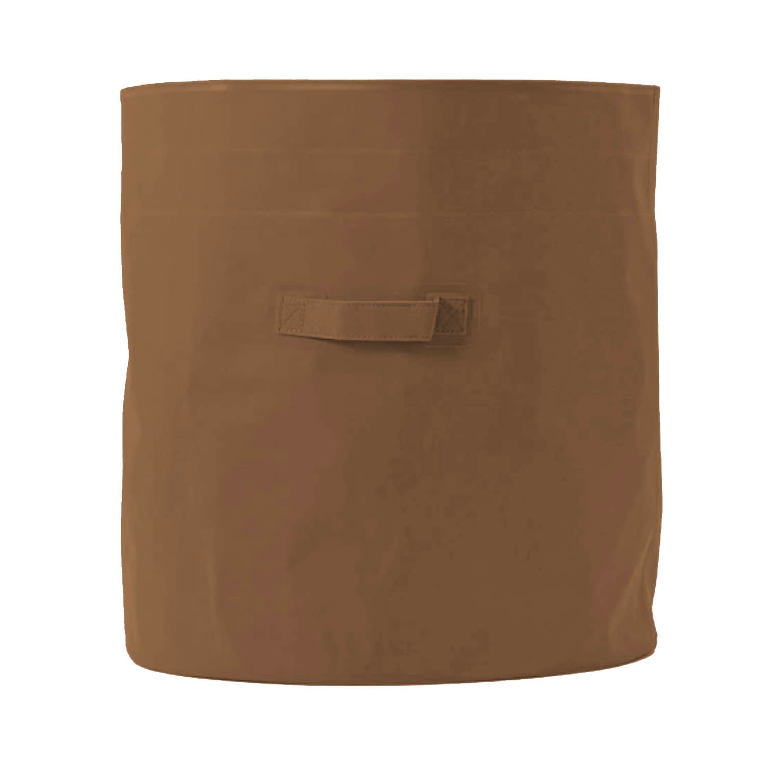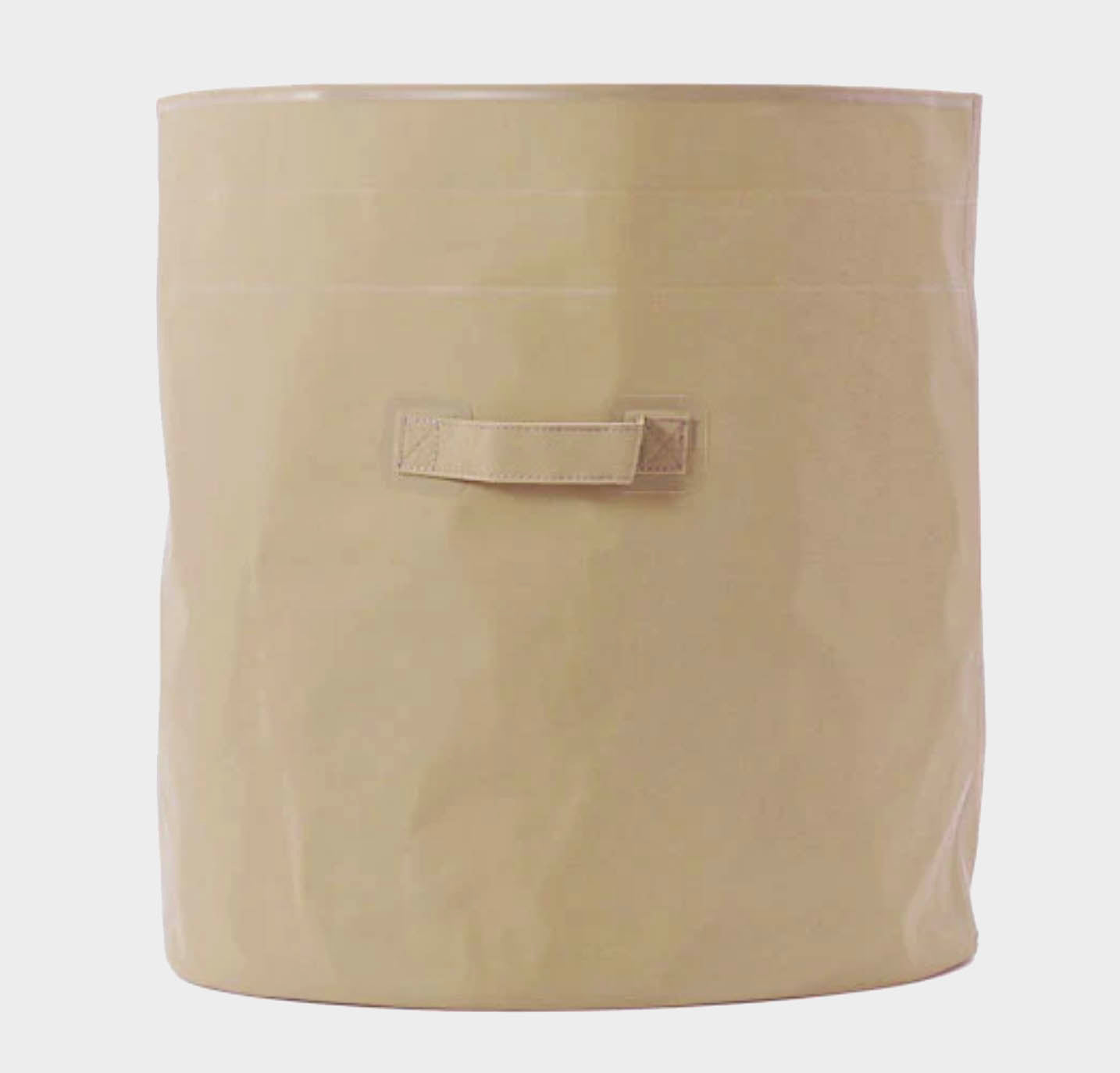 A heavy-duty water-resistant round bag made of PVC tarpaulin by Hightide. Tarpaulin is often used to make sails, banners, and awnings which means this material is known for being highly water-resistant and durable. Use it to for foraging or harvesting, as tool bag, or as a bucket to carry water. The handles make it easy to carry while the sewn seam on the bottom side gives the bag extra strength for storage and standing upright.