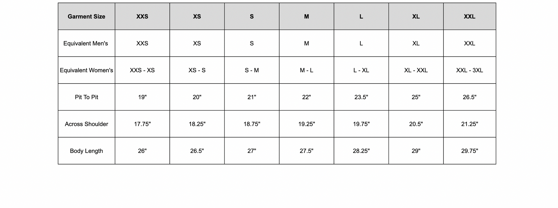 Gardenheir understands that everyone wants their clothes to fit just so. For this reason, we’ve developed a detailed chart to assist. We’ve included “standard” men’s and women’s sizing as a reference along with garment measurements to make sure you get the fit you’re after.