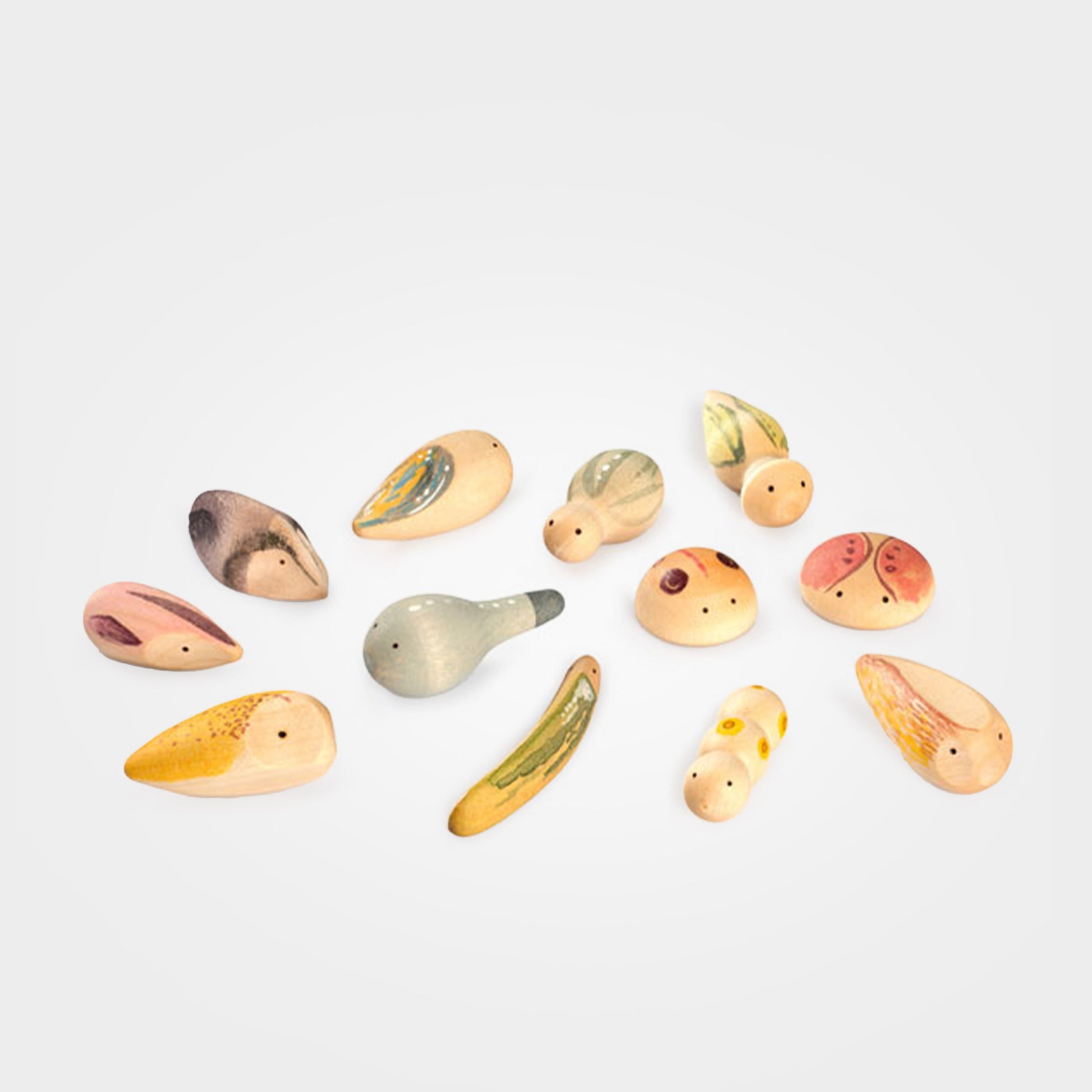 The Wild Wooden Play Set offers a forest of possibility in hand‑sized pieces—animals, insects, and open forms that inspire storytelling, movement, and imaginative worlds. Carefully shaped from solid wood, each creature and element carries the warmth of its material, waiting for little ones to animate them, rearrange them, and bring them to life.